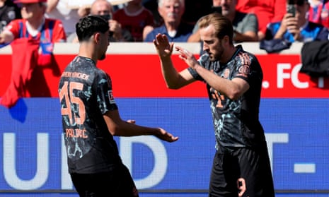 Harry Kane of Bayern Munich celebrates scoring his team’s first goal with teammate Aleksandar Pavlovic at Heidenheim. Photograph: M Donato/FC Bayern/Getty Images