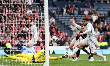Aberdeen will play Celtic or St Johnstone in the Scottish Cup final after a dramatic win over Hearts, who ended the match with nine men. Hearts gave so much to the game, particularly their quadragenarian keeper Craig Gordon, but they couldn’t quite hold on for penalties. The Palestine international Oday Dabbagh scored the winner in the 118th minute.