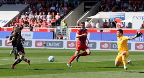 Konrad Laimer slots the ball home to double Bayern Munich’s lead at Heidenheim. Photograph: Ronald Wittek/EPA