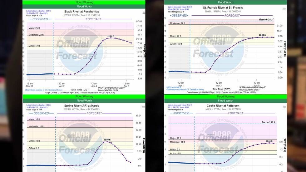 The National Weather Service offices in Little Rock and Memphis have issued River Flood Warnings and a ‘Particularly Dangerous Situation’ Flood Watch in anticipation of excessive rainfall over the next few days.