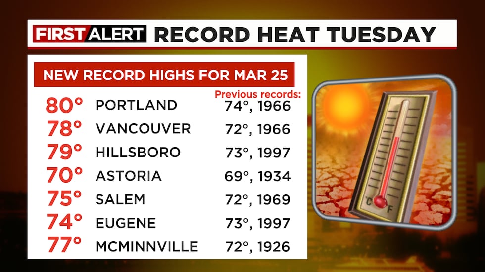 It’s been a beautiful day, and PDX officially reached 80° this afternoon! This ties the record for the warmest March day and the second-earliest 80° at the airport. This morning our low temperature was 51 degrees, breaking a daily record warm low. (Previous: 49° in 1952)