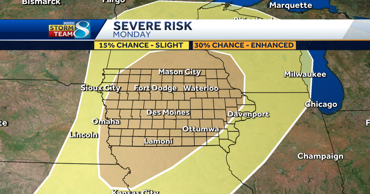 DES MOINES, Iowa —Monday will have the chance to produce strong to severe storms as the next system moves over the Midwest. A warm front will pass over bringing strong southerly winds and very warm temperatures. Highs will be in the 80s with 20 to 30 mph winds and gusts up 45mph or greater.