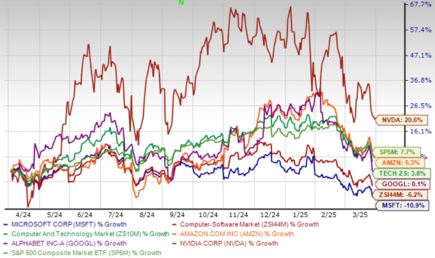 Shares of Alphabet, Nvidia and Amazon have also outperformed Microsoft, returning 0.1%, 20.6% and 5.3%, respectively, in the past year.