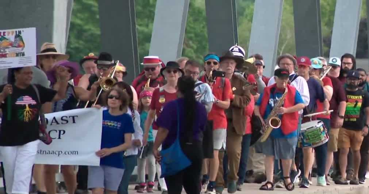 Thursday is Juneteenth, the federal holiday that marks the day the last group of enslaved people in the U.S. became free.It represents a day of liberation for the African-American community. It’s something people have celebrated for more than 150 years.>> Download the free WMUR app to get updates on the go: Apple | Google Play <<Juneteenth commemorates the events of June 19, 1865, two months after the end of the Civil War and two years after the Emancipation Proclamation. On this day 160 years ago, 2,000 troops marched to Galveston, Texas, and told the last group of enslaved people they were finally free.Organizers said Juneteenth is a day that truly honors American history as a whole, and it brings to light the importance of engaging in tough and sometimes uncomfortable conversations about the topic.The largest Juneteenth celebration in the state is held each year in Portsmouth.On Thursday, participants started marching in Kittery and walked over the Memorial Bridge to Portsmouth’s African Burying Ground, a memorial park that honors the lives of enslaved people buried beneath the ground.>> Subscribe to WMUR’s YouTube channel <<Organizers said this year’s march was the largest they have had to date.Events included African drumming and dance, several speeches made by organizations and local and federal elected officials, and a rededication of the African Burying Ground for its 10th anniversary in the city.The Black Heritage Trail of New Hampshire also unveiled its new augmented reality outdoor museum, which brings the area’s history to people through their smartphone.