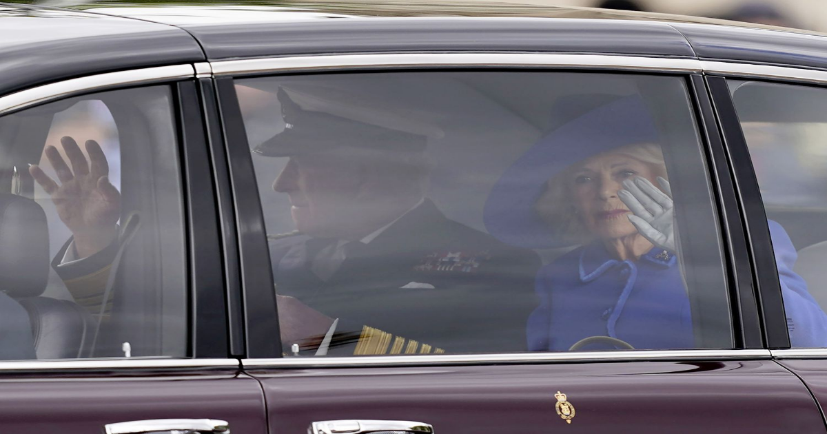 King Charles and Queen Camilla arrive for the military procession marking the 80th anniversary of VE Day, and in honour of those who served during the Second World War on May 5, 2025 in London, England. Credit :