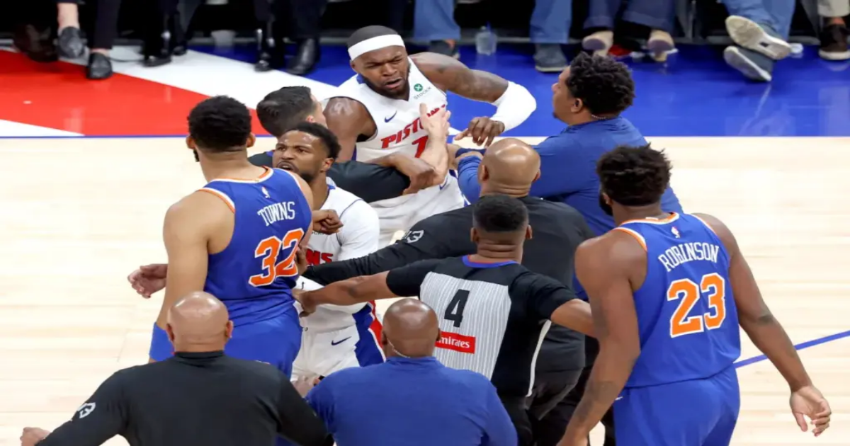 With just under a minute left in the first quarter of their clash against the Pistons Thursday night at Little Caesars Arena, Mitchell Robinson and Paul Reed got in a dust-up before Karl-Anthony Towns came in and shoved Reed.
