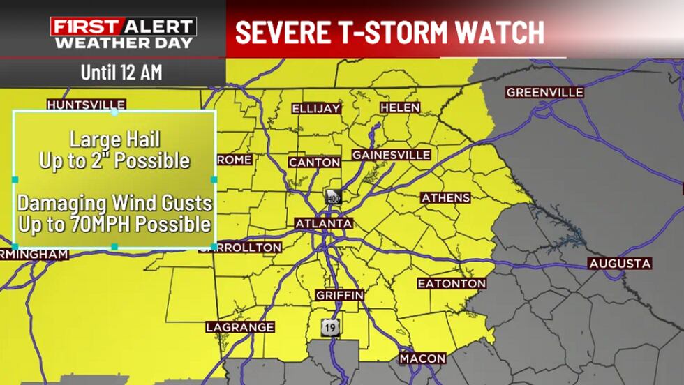 5:08 p.m. | A severe thunderstorm watch has been issued for all of metro Atlanta and north Georgia until midnight.