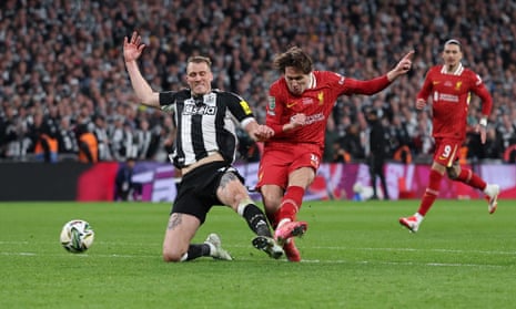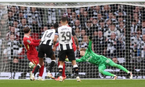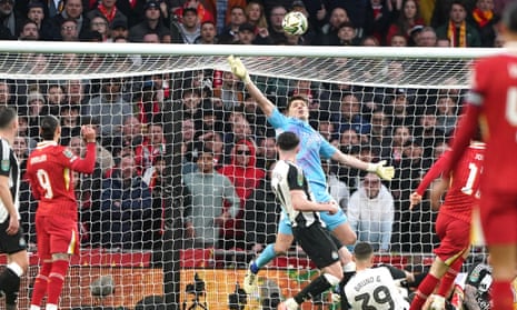 Save: Newcastle United goalkeeper Nick Pope makes a save from a shot by Liverpool’s Curtis Jones. Photograph: Owen Humphreys/PA