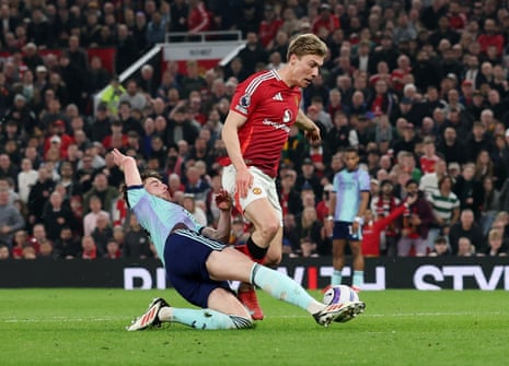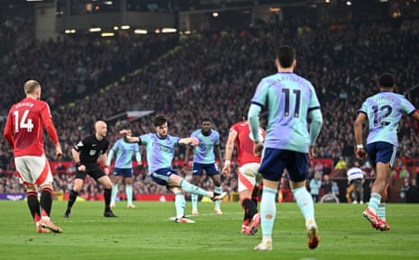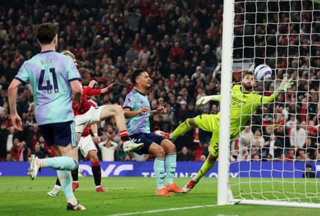 The free-kick’s wall was 11.2m, according to Sky’s boffins. Meanwhile, Mazraoui goes on a burst and Arsenal have to clear. United are targeting that right-hand side. Garnacho goes on a dribble. He’s having Calafiori on toast, which sounds like a rather nice dish, an entree, perhaps.