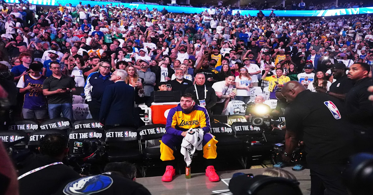 Los Angeles Lakers’ Luka Doncic sits on the bench looking up at a video that was played in the arena as a tribute to the former Mavericks player before an NBA basketball game against the Dallas Mavericks in Dallas, Wednesday, April 9, 2025. (AP Photo/LM Otero)