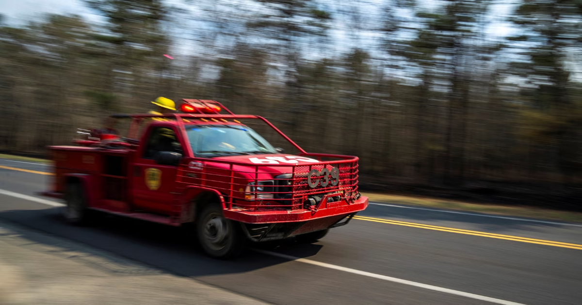 Firefighters rush during a wildfire outbreak, in Forked River, in the Ocean County region of New Jersey, April 23, 2025..