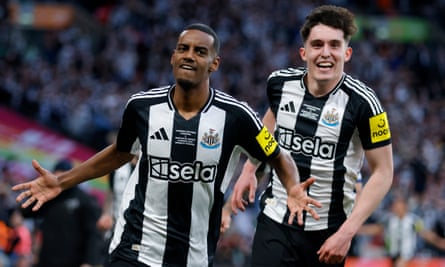 Alexander Isak and Tino Livramento celebrate after Isak scored their second goal. Photograph: Allstar Picture Library Ltd/Nigel French/Apl/Sportsphoto