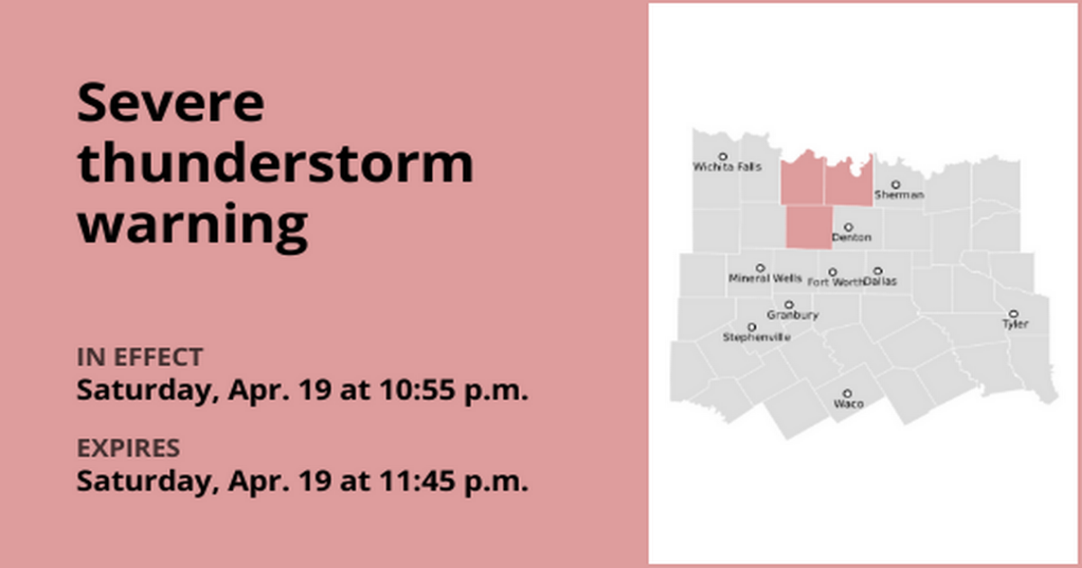 On Saturday at 10:55 p.m. an updated severe thunderstorm warning was issued by the NWS Fort Worth TX in effect until 11:45 p.m. The warning is for Wise, Cooke and Montague counties.