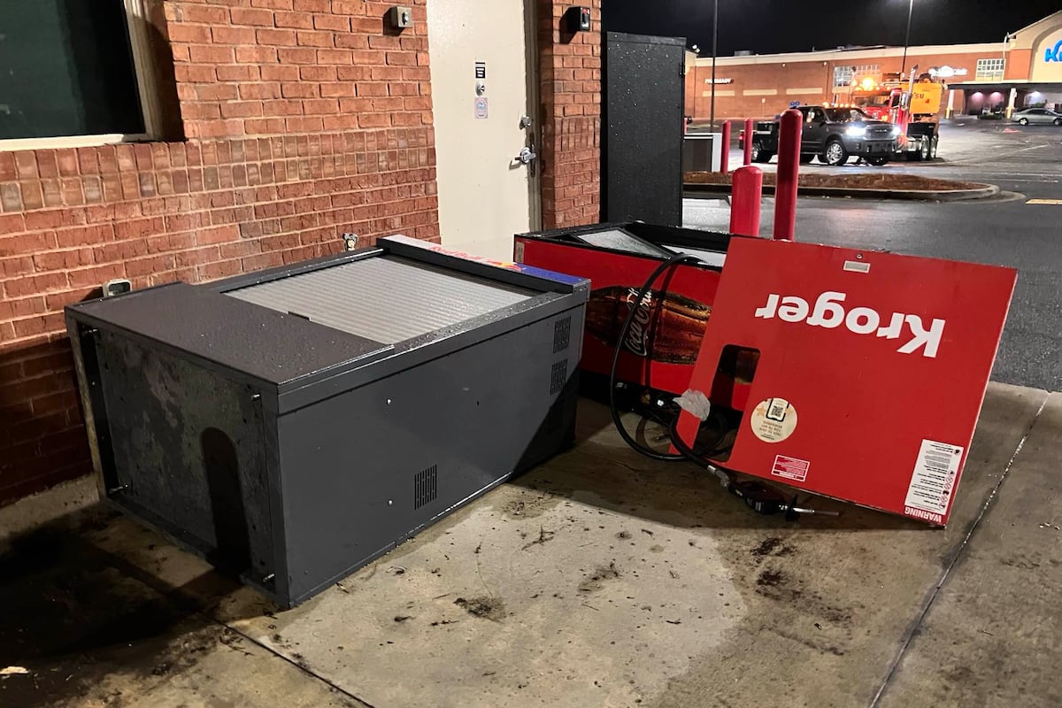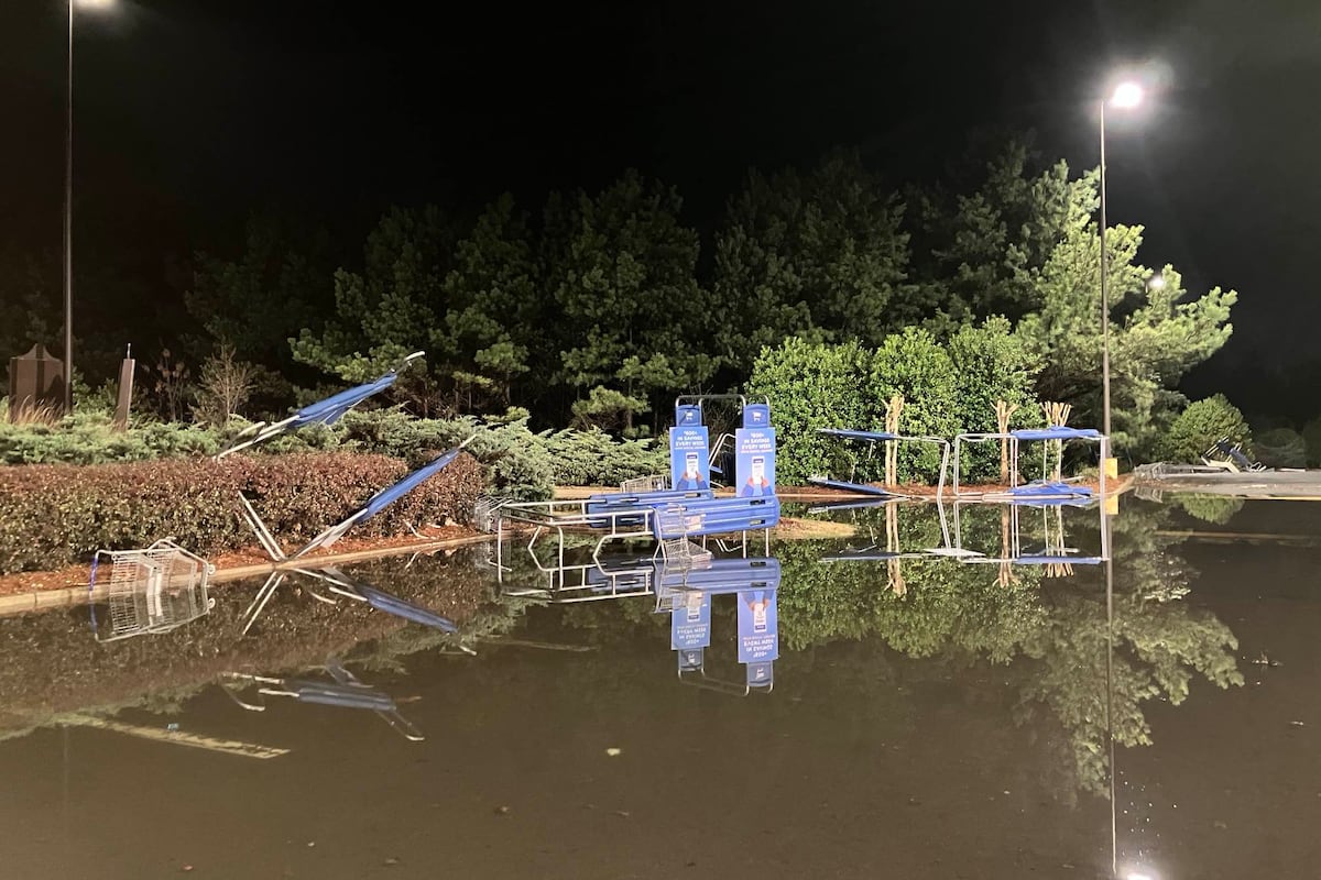 Debris and partial flooding could be seen across a Kroger parking lot on Nathan Dean Boulevard in Dallas, Georgia.