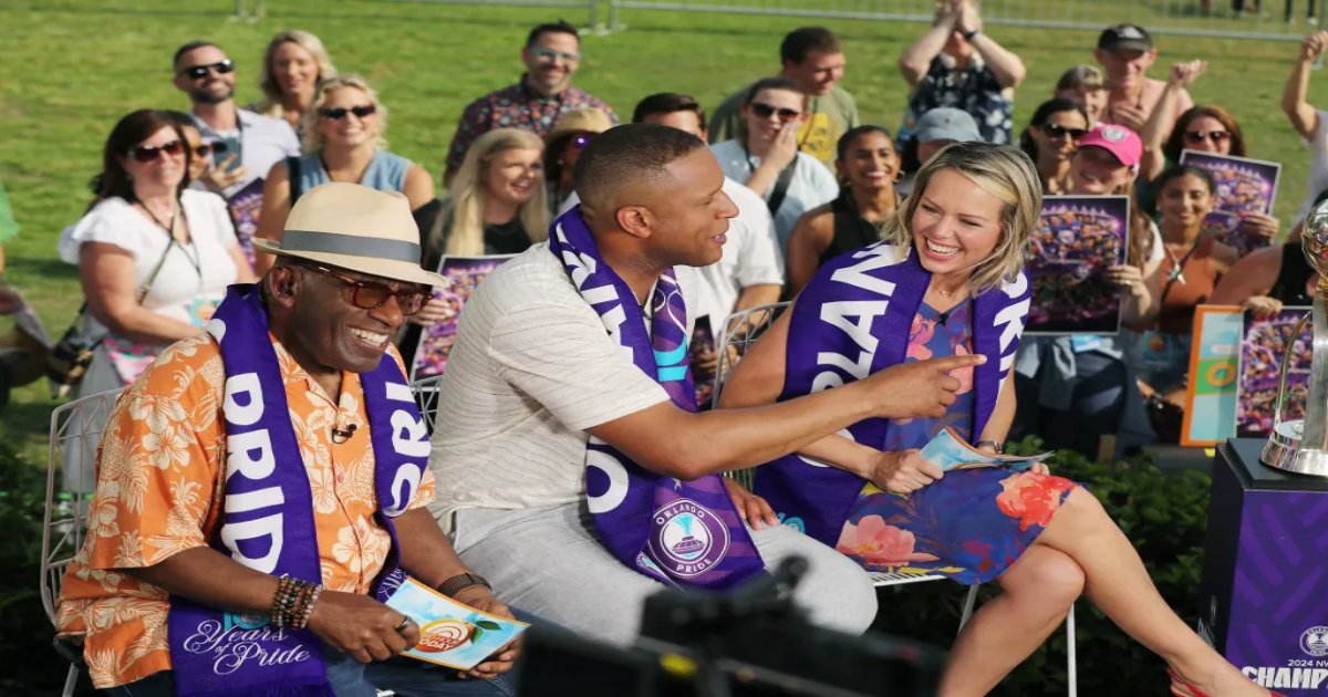 Today show anchors, from left, Al Roker, Craig Melvin, and Dylan Dreyer wear Orlando Pride scarves during filming of the third hour of the show at Central Park in Winter Park on Tuesday, May 20, 2025. The popular network show featured many Orlando-area based guests and themes and is scheduled to air on Thursday morning, May 22. (Stephen M. Dowell/Orlando Sentinel)