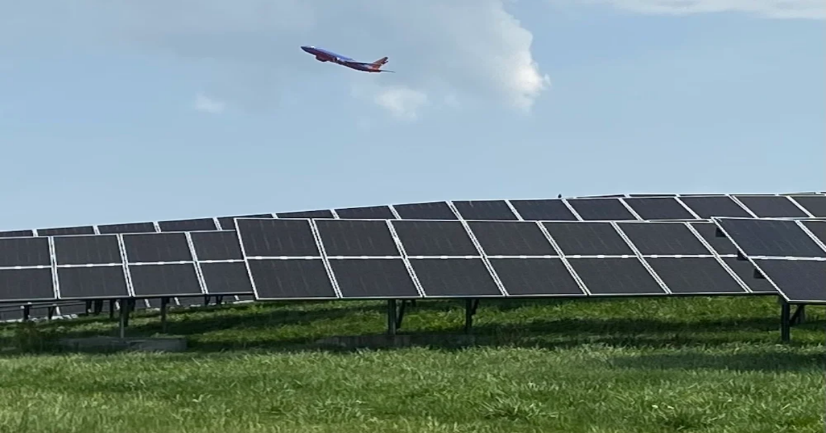 A SOUTHWEST PLANE FLIES OVER THE 10,000 SOLAR PANELS AT PITTSBURGH INTERNATIONAL AIRPORT. THE SOLAR FIELD WILL MORE THAN DOUBLE IN SIZE BY 2027. | PHOTO BY VIRGINIA LINN