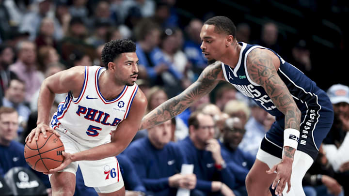 Mar 16, 2025; Dallas, Texas, USA; Philadelphia 76ers guard Quentin Grimes (5) looks to score as Dallas Mavericks forward P.J. Washington (25) defends during the first half at American Airlines Center. Mandatory Credit: Kevin Jairaj-Imagn Images / Kevin Jairaj-Imagn Images