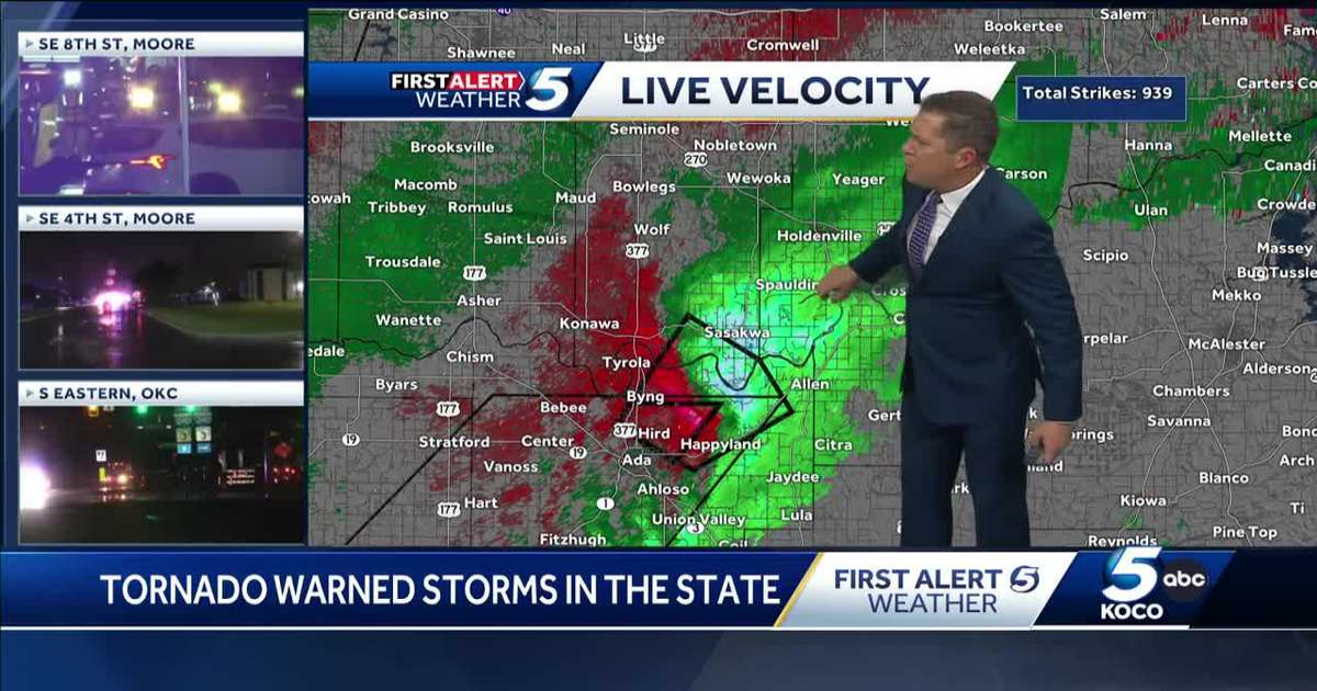 Severe weather is expected to hit Oklahoma overnight, bringing a risk of large hail, damaging winds and a flooding threat due to heavy rainfall.>> Download the KOCO 5 App | Subscribe to KOCO 5’s YouTube channelBelow are live updates from the storm threat. Follow along throughout the night for more information. 11:04 p.m. Saturday Update: A tornado warning was issued for Hughes County for a storm located near Wetumka, moving northeast at 25 mph.10:56 p.m. Saturday Update: First responders are searching for passengers after two vehicles were swept off the road in southeast Moore.The Moore Police Department confirmed on the scene near Southeast 12th Street and S Eastern Avenue that two vehicles went off the road.One of those vehicles was a truck. The driver of the truck and his son were able to escape, according to police. The second vehicle was a Jeep. That Jeep was washed into a creek and wedged against a drainage ditch. One person who was inside that Jeep was accounted for. Two people were not located as of about 10:45 p.m. 10:46 p.m. Saturday Update: A tornado warning was issued for Hughes County for a storm located near Yeager, moving northeast at 25 mph.Another tornado warning was issued for Bryan and Marshall counties until 11:15 p.m.10:39 p.m. Saturday Update: Residents in Holdenville should take shelter immediately. A tornado located just south of town is moving into the city. 10:26 p.m. Saturday Update: KOCO 5 Field Meteorologist Michael Armstrong showed the truck almost completely underwater near SW 4th Street and Interstate 35. The truck was later able to be removed from the drainage ditch. Michael reports that the Moore Fire Department confirmed that the driver of the vehicle was able to get out of the vehicle and make it home.The Moore Police Department is responding to more than a dozen motorist assists. They said the area near the OnCue has been a problem area, as well as areas near Broadway and SW 19th Street, and Southeast 12th Street and South Eastern Avenue. Moore police confirmed that Norman Fire Department and Oklahoma City Fire Department were called to assist with calls, including at Southeast 12th Street and South Eastern Avenue. 10:20 p.m. Saturday Update: A tornado warning was issued for Hughes, Pontotoc and Seminole counties until 11 p.m. The storm was located near Francis, moving northeast at 30 mph.10:17 p.m. Saturday Update: A tornado warning was issued for a storm in Pontotoc County. A confirmed tornado was located near Francis, moving northeast at 20 mph.10:05 p.m. Saturday Update: A tornado warning was issued for Pontotoc and Seminole counties for a storm located over Ada, moving northeast at 20 mph. Anyone in Ada should be in their shelter. Damon is live on Facebook.10:01 p.m. Saturday Update: A tornado warning was issued for Pontotoc County for a storm located 4 miles north of Fitzhugh, moving northeast at 20 mph. Damon is live on Facebook.9:57 p.m. Saturday Update: KOCO 5 Field Meteorologist Michael Armstrong is on the scene of a flooded vehicle on at OnCue near SW 4th Street and Interstate 35 in Moore. 9:48 p.m. Saturday Update: A tornado warning was issued for Pontotoc County until 10:30 p.m. A severe thunderstorm capable of producing a tornado was located near Fitzhugh, moving northeast at 15 mph. Damon is live on Facebook.9:45 p.m. Saturday Update: A tornado warning was issued for Love County until 10:15 p.m. The storm was located 6 miles south of Burneyville, moving northeast at 35 mph, according to the National Weather Service. 9:40 p.m. Saturday Update: Moore police have responded to more than a dozen motorists assists due to flooding. Drivers are encouraged to stay off of the roads. Heavy flooding is scene between Broadway and Tower Drive. There is also heavy flooding in neighborhoods, according to Moore police. 9:32 p.m. Saturday Update: A tornado warning was issued for Carter, Johnston and Murray counties until 10:15 p.m. The warning was issued as a severe thunderstorm capable of producing a tornado is located near Ardmore. Damon is live on Facebook. 9:22 p.m. Saturday Update: A tornado warning has been issued for Garvin, Murray and Pontotoc counties until 10 p.m. The storm was located near Sulphur, moving northeast at 15 mph. Damon is live on Facebook. A tornado watch was issued for Cleveland, Garvin, McClain, Pottawatomie and Seminole counties until midnight. 9:20 p.m. Saturday Update: Two severe thunderstorm warnings were issued for Garvin, Johnston, Murray and Pontotoc counties, and another in Carter, Jefferson and Love counties until 10 p.m. There have been reports of flooding in southwest Oklahoma City, Moore and Norman. 9:04 p.m. Saturday Update: A tornado warning was issued for Carter County on the west side of Ardmore, headed east. The tornado warning was issued until 9:45 p.m. 9:01 p.m. Saturday Update: A severe thunderstorm warning was issued for parts of Love and Carter counties, including Ardmore. The severe storm could bring up to 70 mph winds and golf ball-sized hail. 8:57 p.m. Saturday Update: A new tornado warning was issued for northwestern Love County and southwestern Carter County until 9:45 p.m. A confirmed tornado was located 4 miles south of Wilson, moving northeast at 20 mph, according to the National Weather Service. 8:50 p.m. Saturday Update: KOCO 5 Chief Meteorologist Damon Lane is providing an update on the storm threat live on Facebook. Click here to watch. At about 8:45 p.m., a confirmed tornado was located 7 miles north of Rubottom, moving northeast at 20 mph, according to the National Weather Service. 8:22 p.m. Saturday Update: A tornado warning has been issued for Love, Jefferson and Carter counties until 9 p.m.8:10 p.m. Saturday Update: A tornado warning has been issued for Love and Jefferson counties until 8:30 p.m. A strong thunderstorm located in northwest Oklahoma City is moving northeast at 20 mph. The storms could bring small hail, but they are not expected to be severe-warned. The tornado threat remain