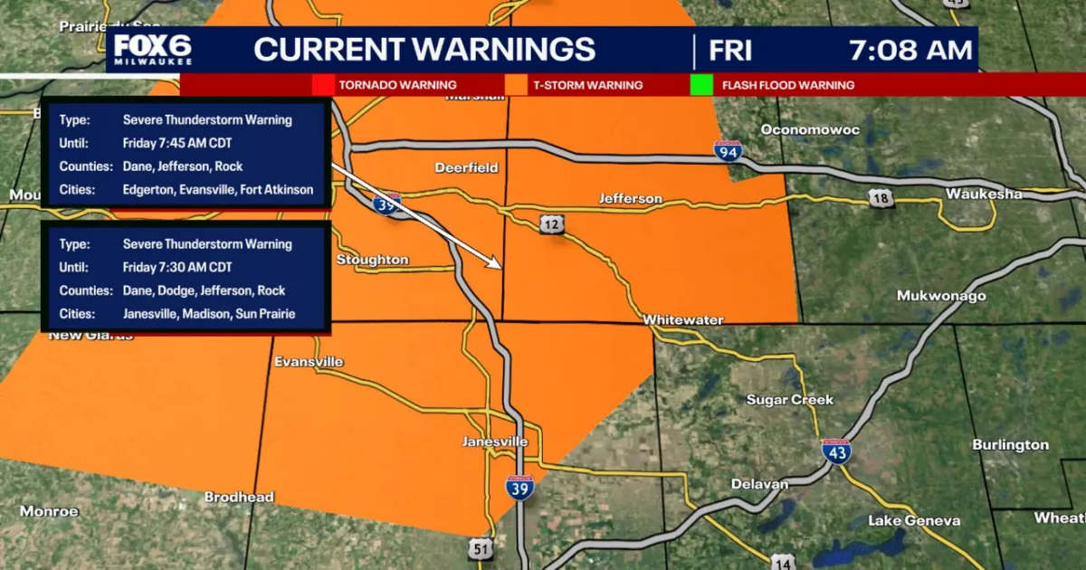 A severe thunderstorm warning is in effect until 8:15 a.m. for the following areas: Dodge County, Walworth County, Washington County, Jefferson County, Ozaukee County, Waukesha County, and Milwaukee County.