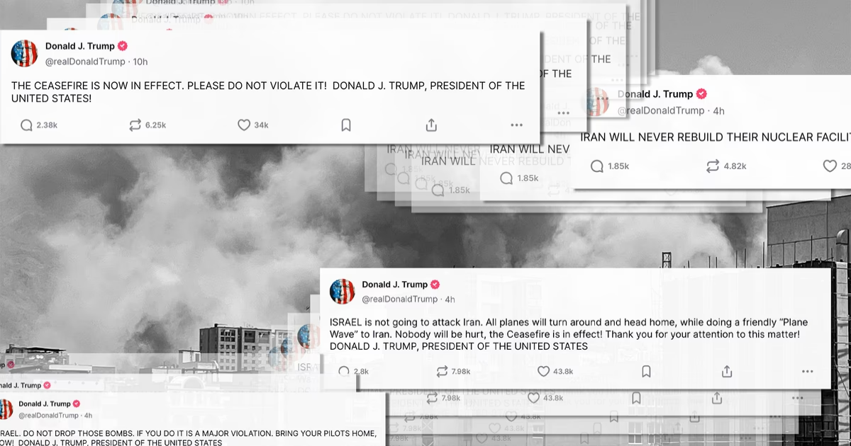 Those early-morning hours of whiplash in the most destructive phase of Iran and Israel’s decades-long conflict underscored the uniquely Trumpian way that the president has managed the hostilities: with a running social-media commentary that has been at times bellicose, at times conciliatory, and always bountiful with his unfiltered views of the war.