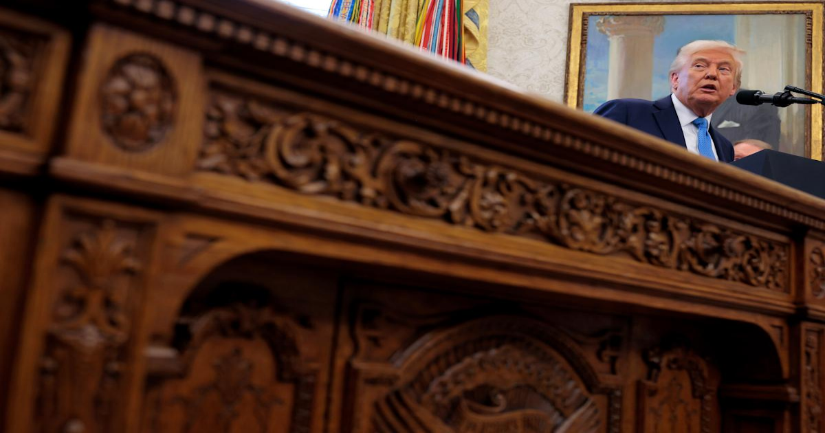 President Donald Trump speaks to reporters in the Oval Office on April 22. (Chip Somodevilla/Getty Images) · Chip Somodevilla via Getty Images