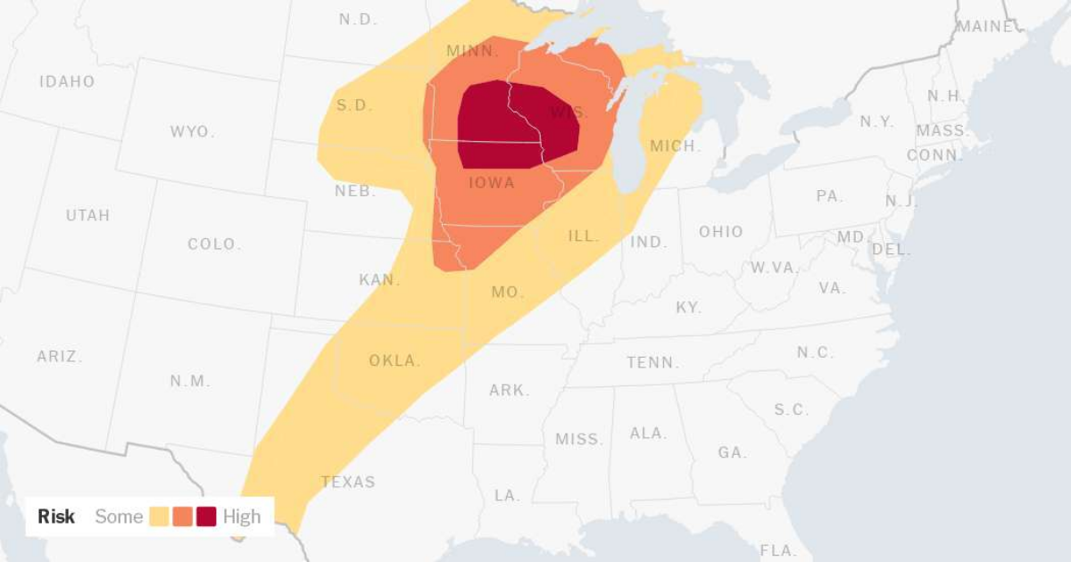 There’s a potential for thunderstorms in a large area all the way from West Texas to the Great Lakes, but central Iowa into southeast Minnesota and western Wisconsin is expected to be in the bull’s-eye of severe weather. This area, which includes Minneapolis and St. Paul, Minn., is under a moderate risk, what’s considered a Level 4 out of 5 by the National Weather Service’s Storm Prediction Center.