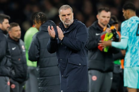 Tottenham Hotspur manager Ange Postecoglou applauds the fans after the final whistle. Photograph: Tom Jenkins/The Guardian