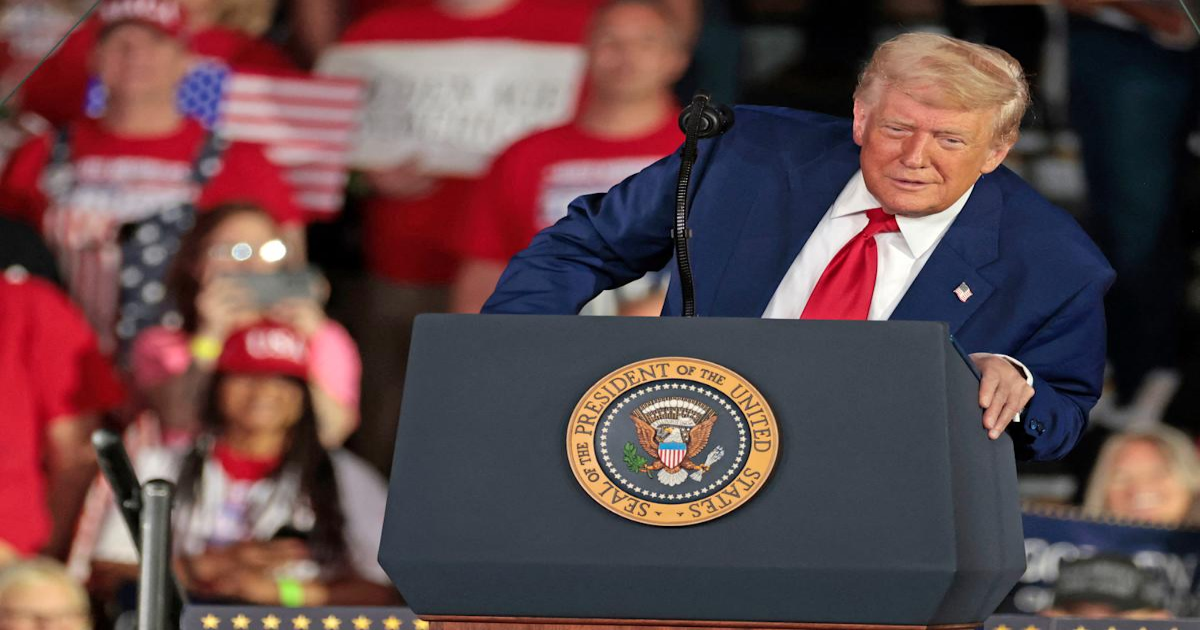 President Donald Trump delivers a 100th Day in office speech Michigan, on April 29. (JEFF KOWALSKY/AFP via Getty Images) · JEFF KOWALSKY via Getty Images