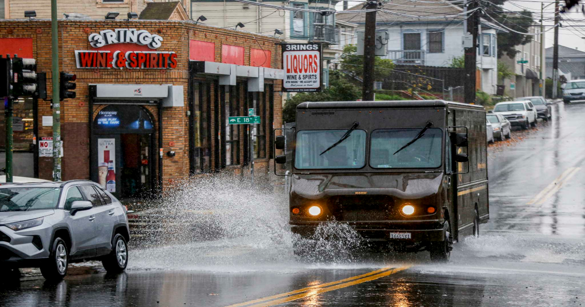 A UPS delivery truck drives through a puddle in Oakland. The company announced on Tuesday that it will eliminate 20,000 jobs and close 73 facilities by June, citing economic uncertainty and a significant reduction in business from Amazon, its largest customer.